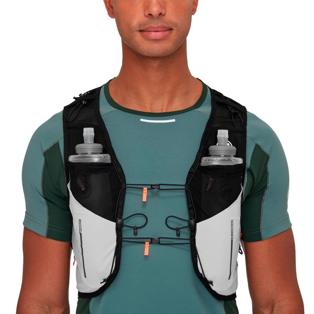 Esto significa que nada se interpone en el camino de un ajuste óptimo, el chaleco se ajusta perfectamente y no tolera las sacudidas ni las rozaduras. El bolsillo trasero con cremallera, dos soportes para botellas blandas (botellas incluidas), un compartimento para su sistema de hidratación y dos bolsillos de acceso rápido para gel y barritas energéticas ofrecen suficiente espacio para todas las pequeñas cosas importantes más un poco de lujo. Déjate sorprender de lo lejos que llegas con tan poco.
